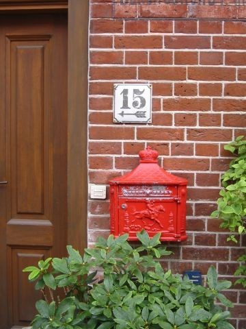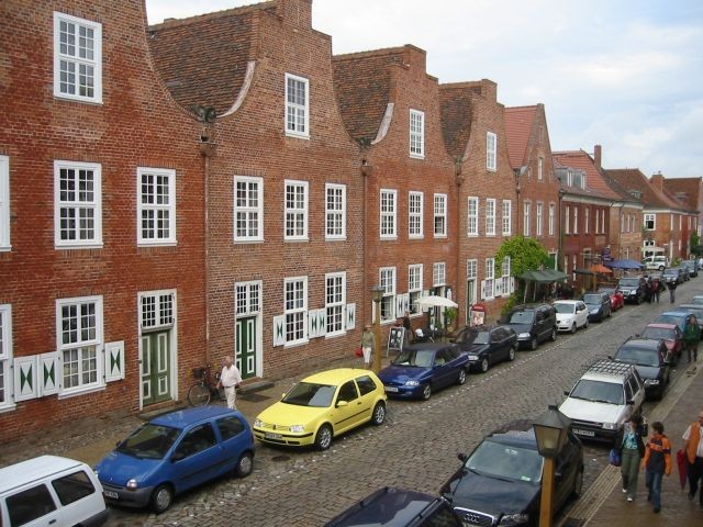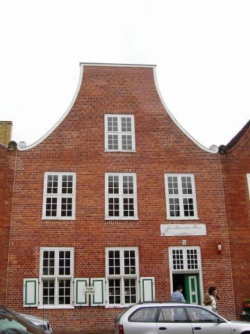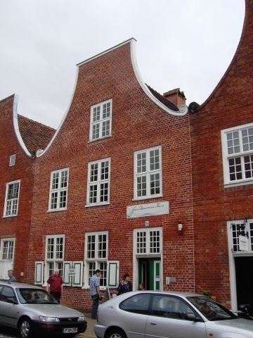 Backsteinhäusern in holländischem Stil - unverputzt, mit weißen Fugen, Fensterläden und zum Teil geschwungenen Giebeln.