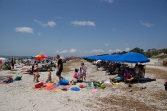 Der Strand war knüppelvoll, Sonnenschirm an Sonnenschirm, alles fein in einer geraden Reihe. Das Atlantikwasser war ca. 24°C warm, die Lufttemperatur betrug ca. 33°C – also sehr, sehr schweißtreibend.