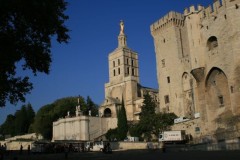 Egal wo man steht und geht, kann man die mächtigen Mauern und Türme des Palais des Papes und die goldene Madonna auf der Turmspitze des Domes sehen. Auf dem Platz vor dem Palais kaufte Bine Andenken für unsere Lieben daheim, ich machte mich auf Fotoexkursion durch den Park, wo ich Gelegenheit hatte, den Palais und die Brücke aus allen Blickwinkeln zu knipsen. Nach einem leckeren Imbiss in einem Straßencafe auf dem Palaisplatz unternahmen wir noch eine kurze Stadtrundfahrt mit einer Bimmelbahn.