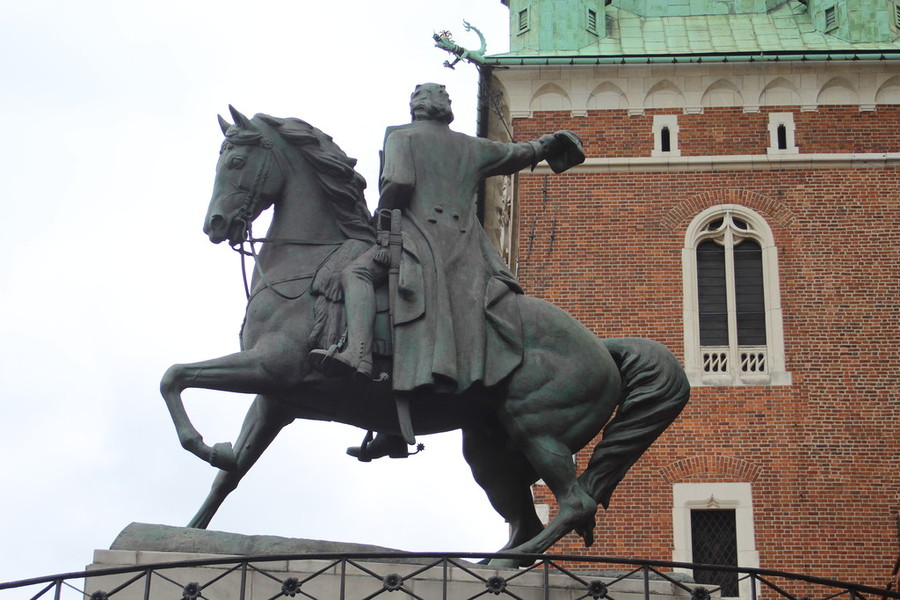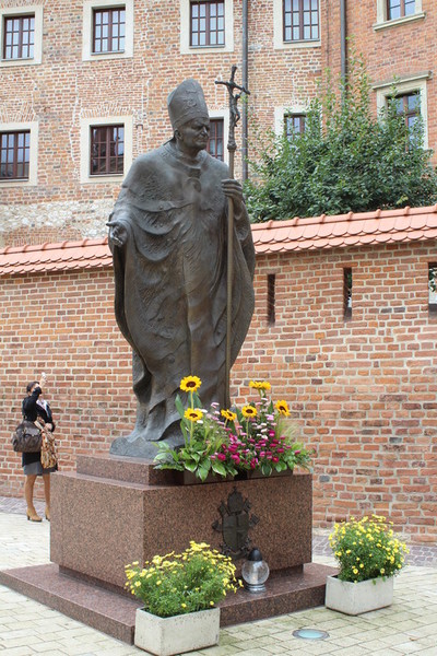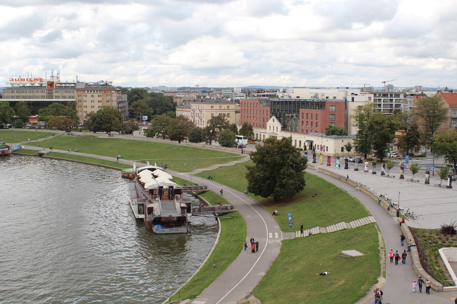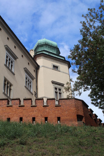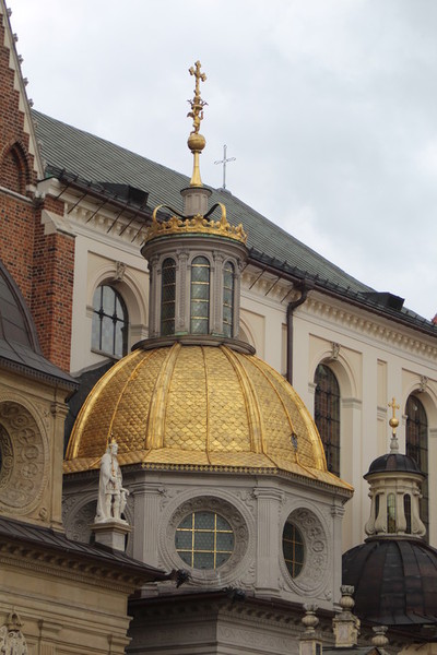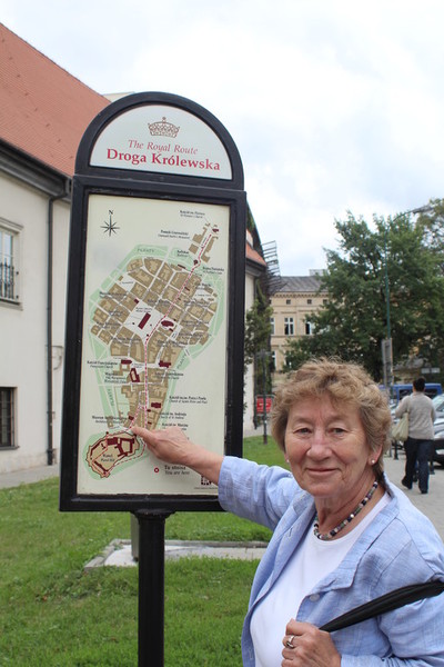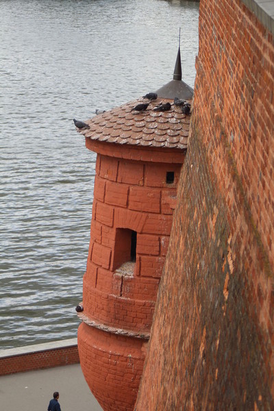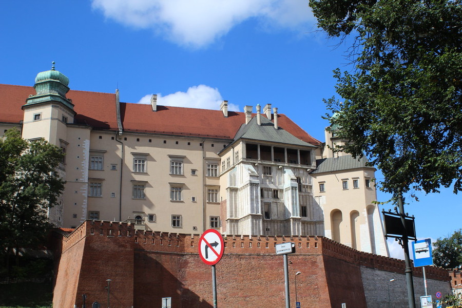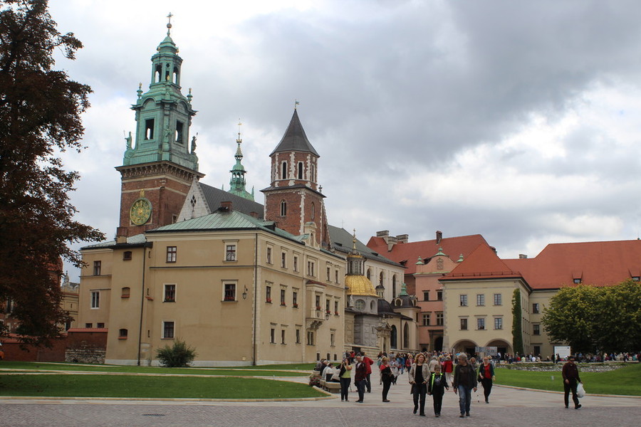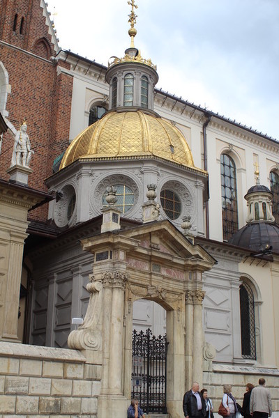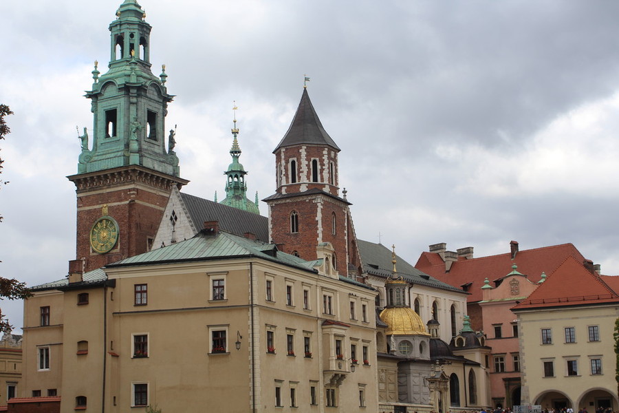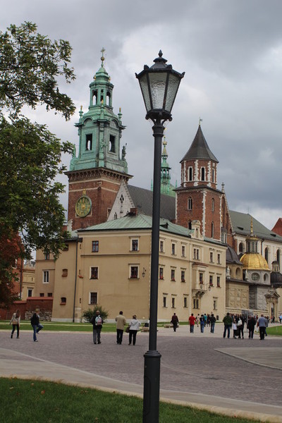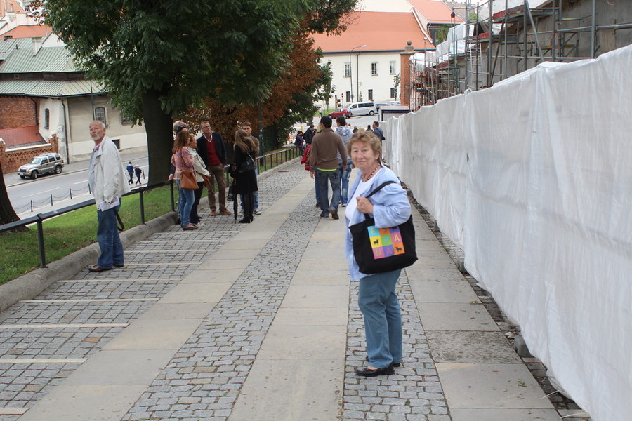 Gesagt – getan. Wir stiegen in die Tram und fuhren bis zum Wawel. Dort stiegen wir auf ziemlich steilen Wegen hinauf zur Königsburg. Der Wawel ist ein Symbol des polnischen Staatswesens, das fest mit dem polnischen Volk verknüpft ist. Das Gebäudeensemble besteht aus der Wawel Kathedrale, dem Königsschloss und den Befestigungen. Unzählige Touristen bevölkerten den Platz, wir folgten einem Touristenweg durch die Kathedrale, sahen viele Gräber und auch das Grab der Hl. Jadwiga, Königin von Polen. Nachdem wir die Türme der Befestigungen ausgiebig betrachtet und fotografiert hatten stiegen wir denn hinunter in die Altstadt.
