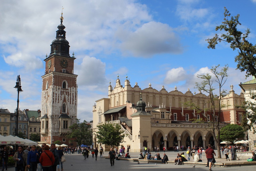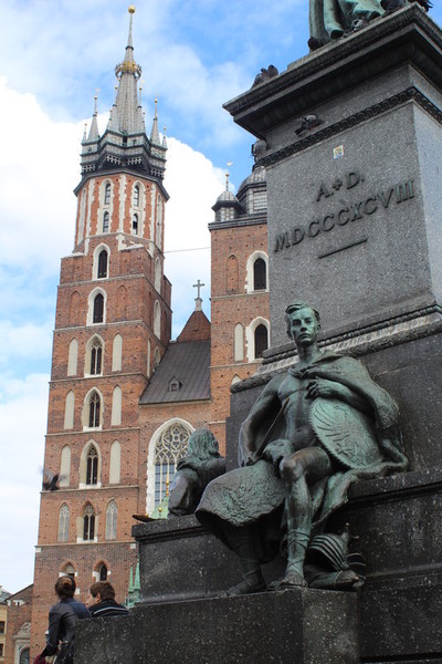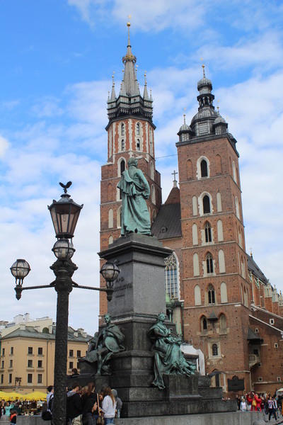 Durch Straßen und Gassen mit schönen Fassaden gelangten wir zum Hauptmarkt. Dieser Platz wird eingerahmt von der Marienkirche, der Adalbertkirche und an der Langseite von den Tuchhallen. Der quadratisch angelegte Hauptmarkt – Rynek Glowny – soll einer der schönsten Märkte Europas sein. Restaurants mit ihren Sitzplätzen, Sonnenschirmen säumen den Platz, Pferdedroschken passieren im Minutentakt den Platz und mitten auf ihm thront das Denkmal des polnischen Nationaldichters Adam Mickiewicz.