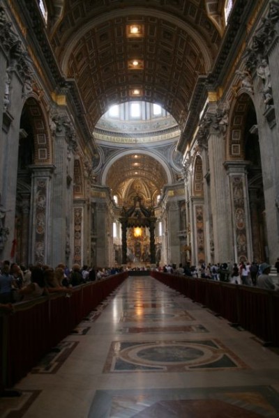 Der Platz vor dem Petersdom ist einfach bombastisch in seiner Ausdehnung und Weiträumigkeit. Wir reihten uns in die Besucherschlange ein, wurden kontrolliert und dann standen wir staunend und ehrfürchtig in dem gewaltigen Kuppelbau des Petersdomes.