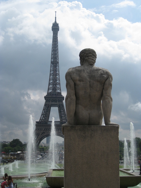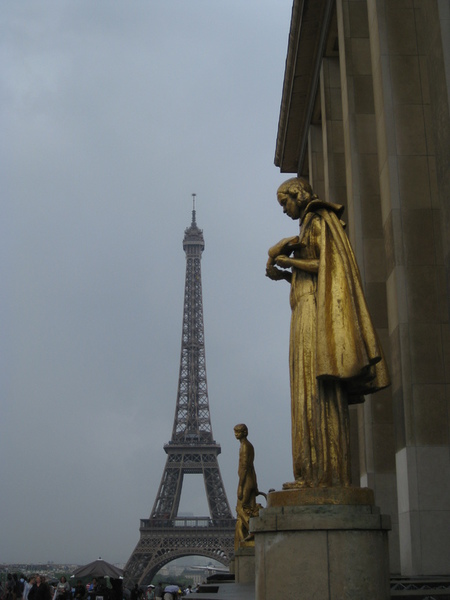 Wir suchten Unterschlupf im Vorraum eines Museums, warteten den Schauer ab und dann - ja dann sahen wir den Eiffelturm in seiner ganzen Größe und Schönheit - leider vor wolkenverhangenem Himmel. Tausende Touristen fotografierten wie wir diese wirklich schöne, grazile Eisenkonstruktion.